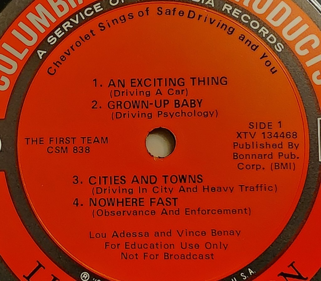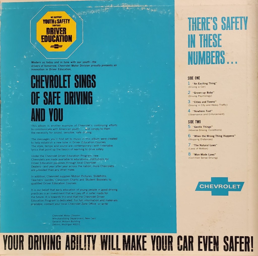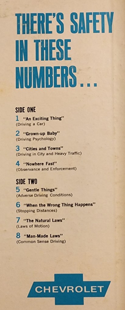 One of the strangest records I have in my collection is Chevrolet Sings of Safe Driving and You. This was an album made for driver’s education classes in the 1960s. Various dates are attributed to this title online, spanning 1964-1969, and no date is stamped or printed on the album.